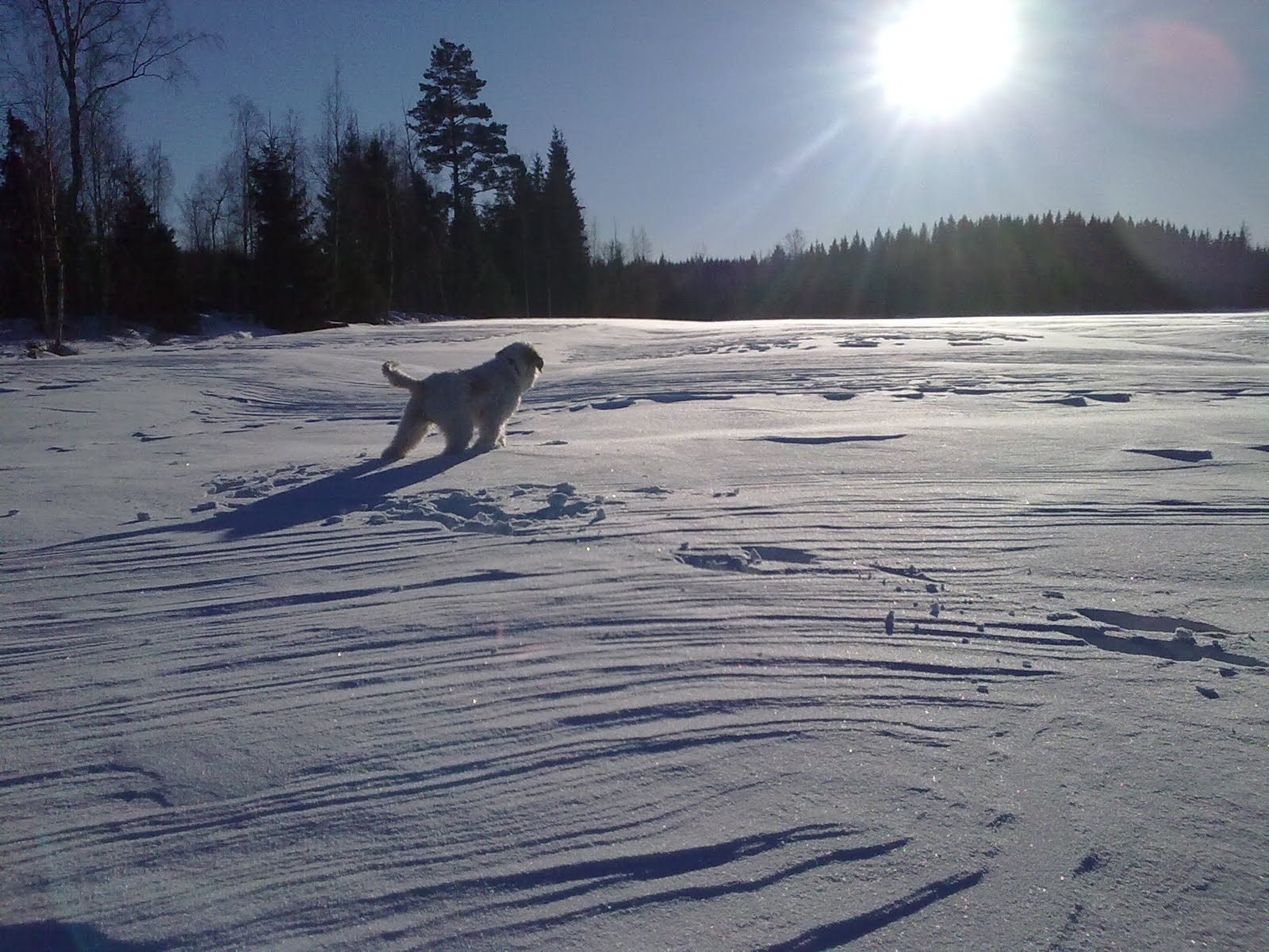Tänään oli tuulinen ja aurinkoinen ilma. Lumipallot lensivät myötätuuleen heittettynä pitkälle ja mä menin lumi pölisten perässä!